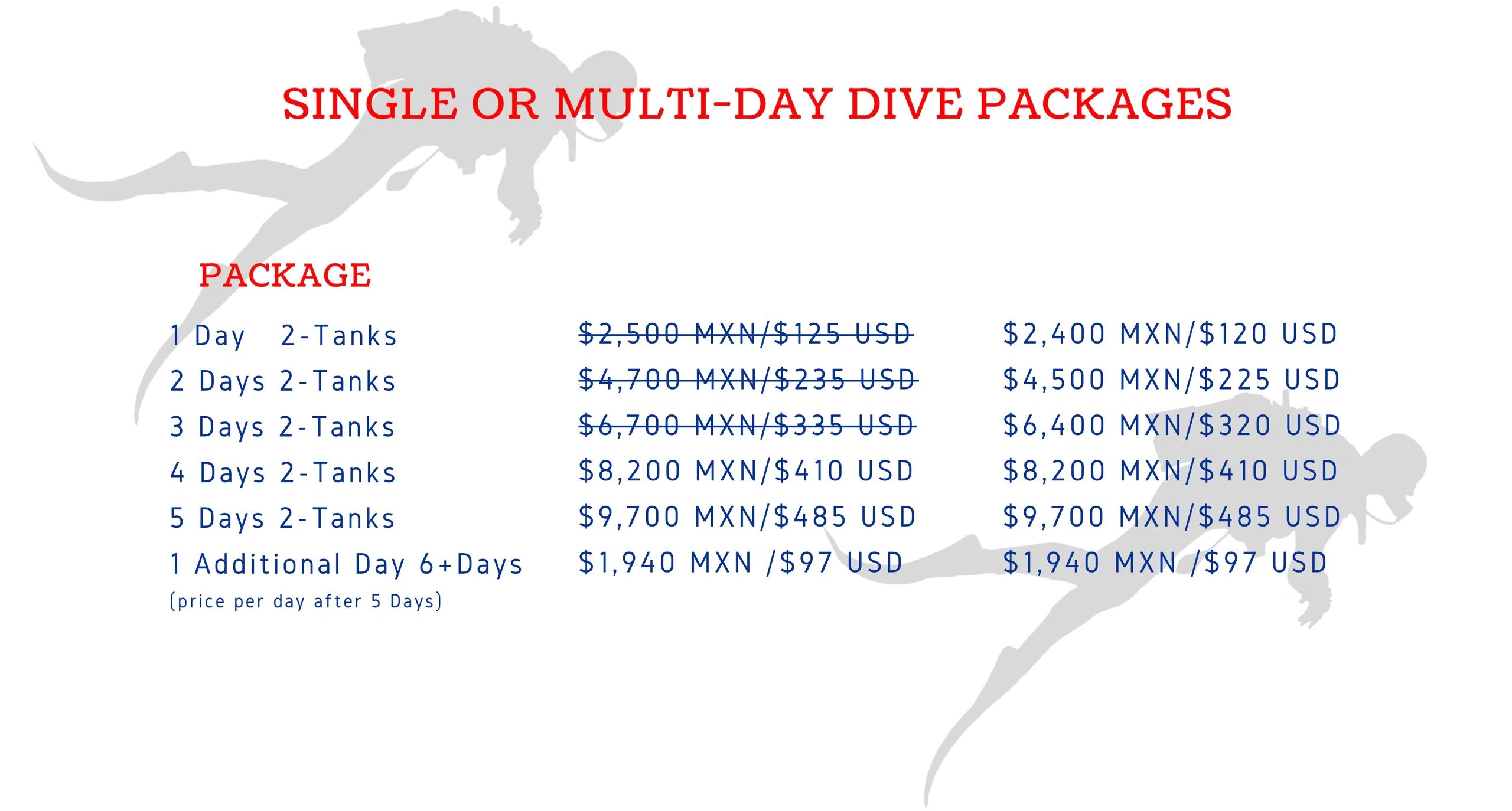 Two-Tank Dive Trip: Available for groups $11,500 MXN / $650 USD per day for a two-tank dive for 1-4 divers.